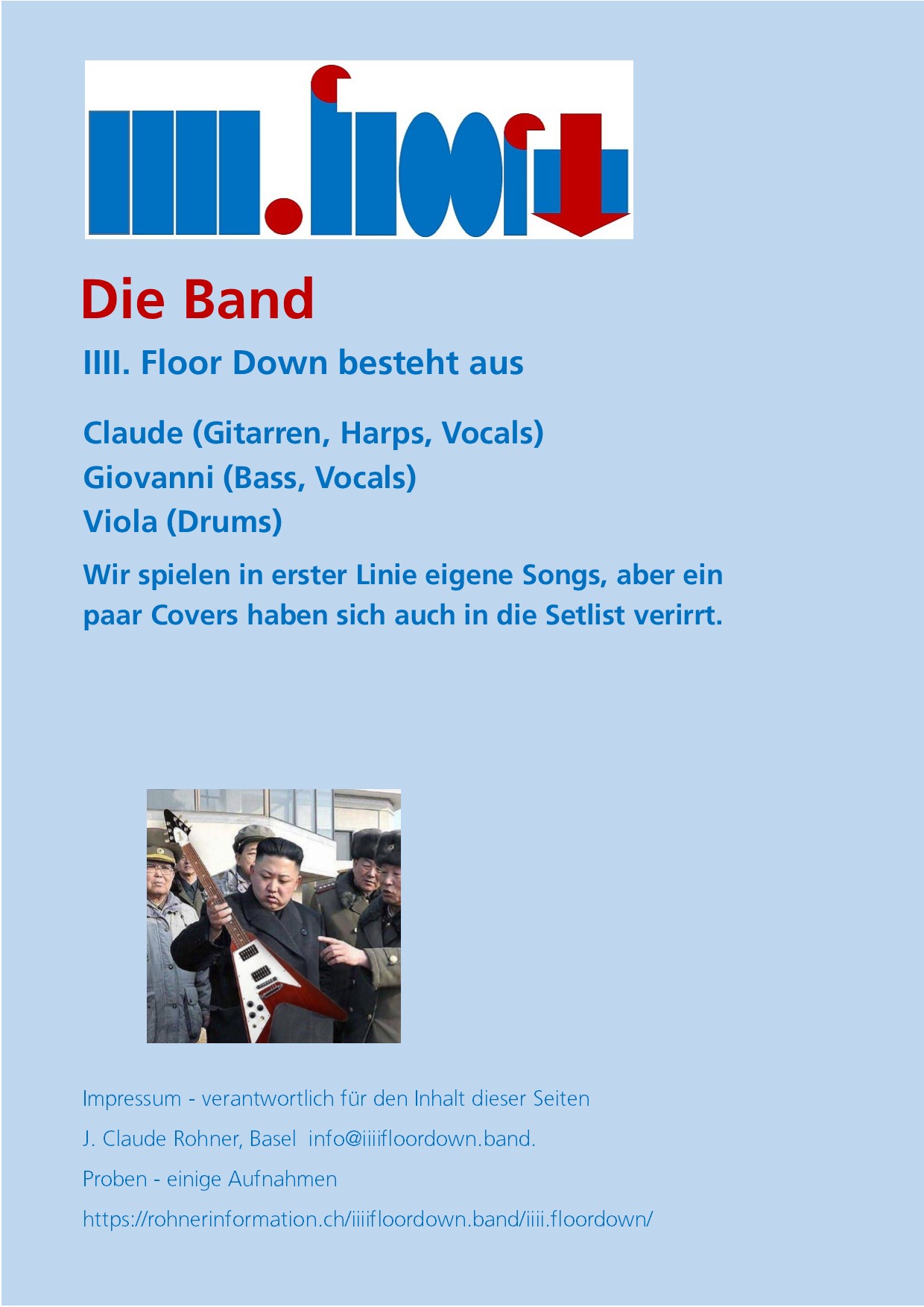 Wir sind eine Bluesrock-Band, die vorwiegend eigene Sachen spielt (da haben wir freie Hand!). Wir – Giovanni: Bass, Vocals, Viola: Drums, Claude: Vocals, Gitarre, Harp – spielen zum Plausch und haben uns damit abgefunden, dass die Rolling Stones berühmter und reicher sind als wir; wir haben dafür weniger Stress.