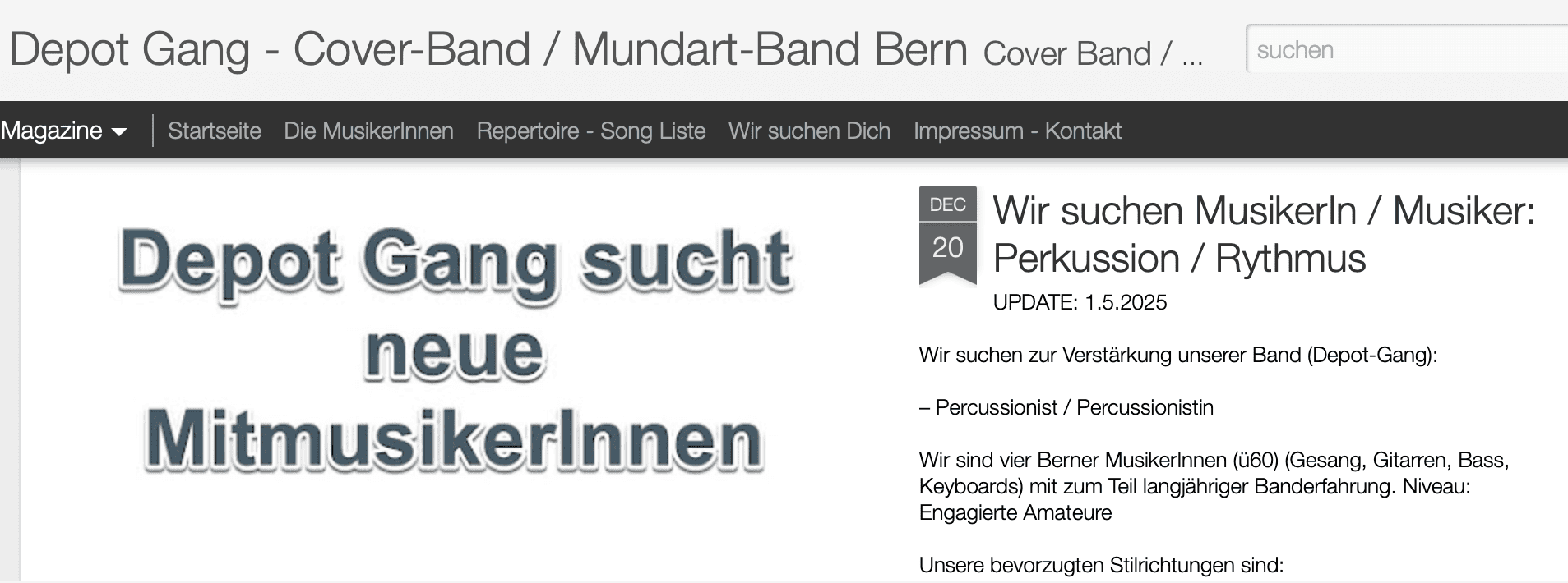 Wir sind vier nicht mehr ganz junge Berner MusikerInnen mit Banderfahrung (Gesang, Gitarre, Bass, Keyboard) und suchen zur Verstärkung eine/n zuverlässliche/n Percussionist/in oder Drummer/in. Unsere bevorzugten Stilrichtungen sind Americana, Folk, Chansons, Canzoni, Alternativ … es darf aber durchaus auch mal etwas rockiger und fetziger sein. Schön wäre es auch (optional) wenn du uns mit deiner Stimme unterstützen könntest.
