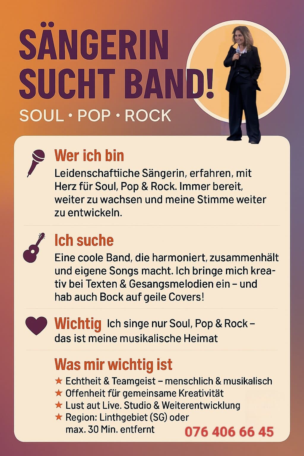 Ich bin eine leidenschaftliche Sängerin aus dem Linthgebiet (SG) mit Herz für Soul, Pop und Rock. Ich bin kein Profi, habe aber schon Erfahrung und möchte meine Stimme weiterentwickeln. Darum suche ich eine Band, mit der ich dranbleiben und gemeinsam wachsen kann. Musik bedeutet für mich Ehrlichkeit, Gefühl und Spass – am liebsten, wenn man live spielt und in den Gesichtern das Happy-Face sieht.