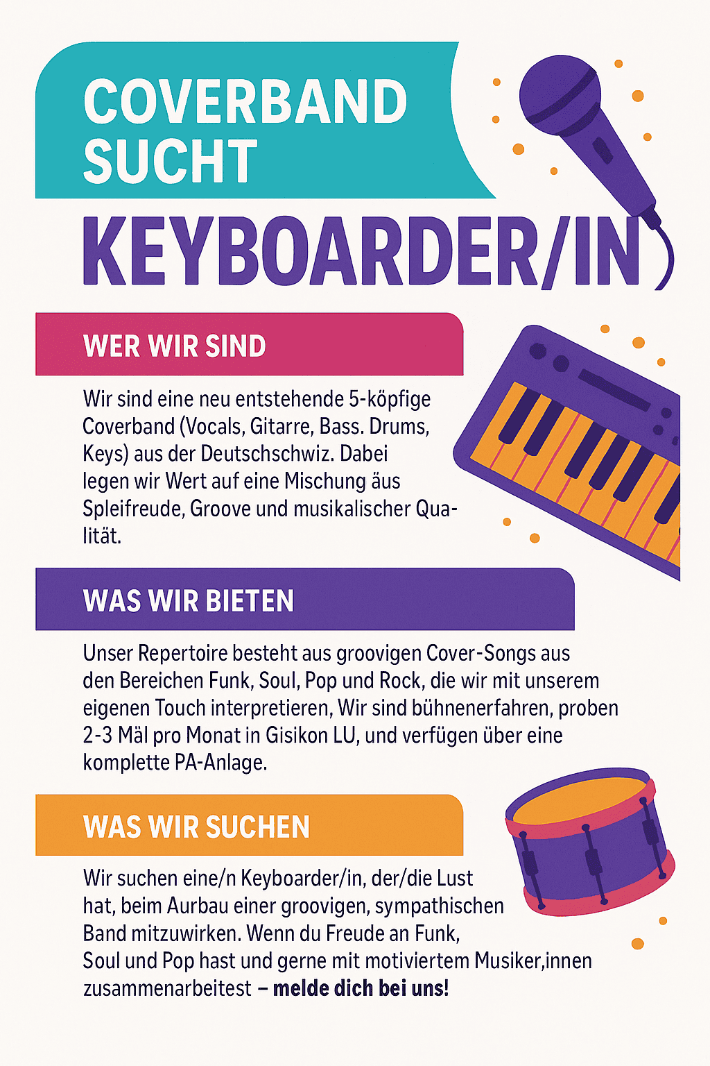 Hast du Lust, beim Aufbau einer groovigen Band dabei zu sein? Dann melde dich bei uns – wir freuen uns auf dich!